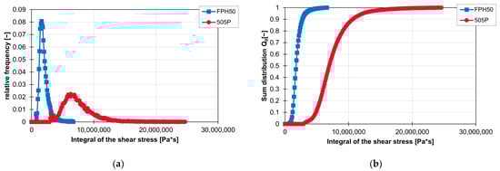 Graph of the relative frequency of the integral of the shear stress (a) and graph of the cumulative distribution of the integral of the shear stress (b) for the ZME on the ZSK25 at 200 rpm with the two materials FPH50 and 505P.