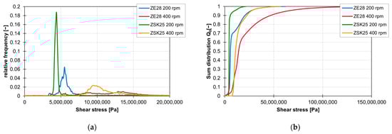 The influence of the extruder size on the value of the shear stress integrals is illustrated in Figure 23. Figure 23a shows the relevant range of the frequency distribution of the shear stress integrals. The peaks of the shear stress integrals of the ZSK25 always lie before the peaks of the integrals of the ZE28 at the respective rotation speeds. As can be seen in Figure 23b, a change from the ZSK25 to the ZE28 also leads to higher final values of the shear stress integrals, and the number of integrals with high values increases.