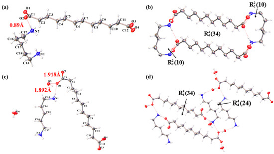 Figure 2a reveals that anhydrate of PDA-DCA only has one N-H…O strong hydrogen bonding interaction [31]. The amino groups at both ends of PDA connect with the carboxyl groups of adjacent DCA to form a closed-loop synthon of (10) [32,33], while the four carboxyl groups at both ends of adjacent dodecanedioic acid connect with the two amino groups at both ends of PDA to form a synthon of (34), as depicted in Figure 2b. From Figure 2c, compared with anhydrate, there are two kinds of hydrogen bonds in the crystal structure of the dihydrate that contact N-H…O and O-H…O; H atoms on water molecules and O atoms on the carboxyl group of DCA interact through a hydrogen bond. From Figure 2d, the dihydrate not only forms a synthon (34) similar to the anhydrate, but also, the adjacent PDA is linked to the carboxyl group on the DCA molecule through water molecules to form a new supramolecular synthon (24).