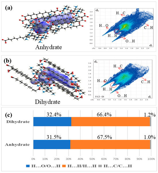 Hirshfeld surface analysis and fingerprint analysis of two crystal forms of PDA-DCA: (a) anhydrate, (b) dihydrate, and (c) statistical analysis.