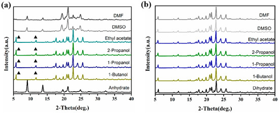 We conducted SMPT experiments using different solvents at room temperature to investigate their influence on crystal form transitions and explore the possible occurrence of new crystal forms [36]. As shown in Figure 5, no new phases were observed. We discovered that the anhydrate transformed into dihydrate in ethyl acetate, 1-propanol, 2-propanol, or 1-butanol, while the dihydrate maintained its original crystal structure. This suggests that the dihydrate may exhibit greater stability compared to its anhydrate counterpart.