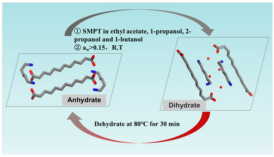 In conclusion, Figure 7 illustrates the mutual transformation relationship between the anhydrate and dihydrate forms of PA512 salt. The anhydrate can be converted to the dihydrate via SMPT in solvents such as ethyl acetate, 1-propanol, 2-propanol, or 1-butanol for 12 h, or by translation for 12 h within a water activity of 0.15 (water–ethanol) at room temperature. Similarly, the dihydrate can be transformed into the anhydrate through dehydration in a vacuum drying oven at 80 °C for 30 min.