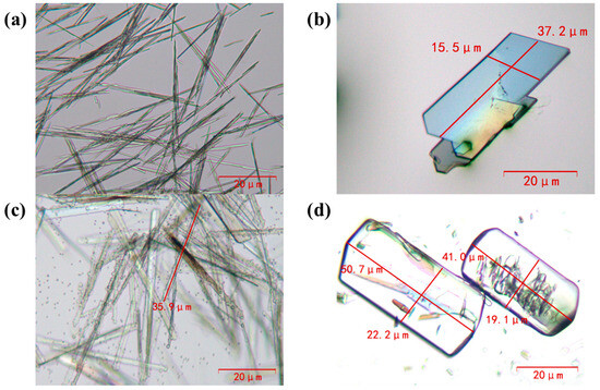 Figure 8a,c illustrate the different crystal habits of samples with different crystal forms. The anhydrate is needle-like while the dihydrate is rod-like. Ultrasound can break the crystals to a certain extent, controlling their size, and the resulting cavitation bubbles can significantly affect crystal growth [38]. When combined with crystallization processes, ultrasonic action can effectively improve crystal habits. As shown in Figure 8b, through the coupling of dissolution crystallization and ultrasonic pretreatment with a 100 W probe for 60 min, the morphology of anhydrate changed from needle crystals to quadrilateral sheets. For the preparation of the dihydrate, water bath ultrasonic pretreatment (100 W, 60 min) was used before cooling crystallization, which transformed the dihydrate from rod-like to massive, as illustrated in Figure 8d.