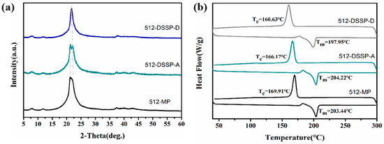 The effects of different crystal forms (anhydrate and dihydrate) of PA512 salt on the polymerized product were investigated using DSSP at a polymerization temperature of 140 °C, and traditional melting polymerization (MP) was also performed as a contrast, as illustrated in Figure 11a. Notably, structural differences between the products were obtained from different crystal forms. The characteristic peak of the polymerized product obtained from anhydrate as raw material exhibits an obvious double peak around 21.5° of 2θ in the PXRD pattern, while that of the dihydrate as raw material displays a single sharp peak.