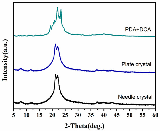 In the case of DSSP, factors such as crystal size, size distribution and crystal habit (fiber, needle, block, etc.) may influence the polymerization process and polydispersity of the polymer by altering the number of repeating units. In this study, we investigated two types of PA512 salt with different particle morphologies as raw materials for polymerization. To eliminate the influence of crystal water molecules, the above-mentioned anhydrate was used as the feedstock. One is the original needle crystalline powder; the other is plate crystals obtained by ultrasonic treatment, and the direct dehydrated PDA and DCA were used as a contrast. The results are shown in Figure 12. As shown in Figure 13, The polymerized products obtained by PA512 crystalline anhydrate salt appear to have a higher melting point, and that of massive anhydrate crystals exhibits greater hardness and elastic modulus with 3.7 GPa (Table 5).