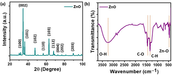 The structure of the synthesized nanomaterial was analyzed using X-ray diffraction (XRD). Figure 2a illustrates the XRD spectra for pure ZnO synthesized via the hydrothermal method. The observed XRD peaks at 2θ values of 31.77°, 34.47°, 36.27°, 47.57°, 56.62°, 62.97°, 68.62°, 72.72°, 76.97°, and 89.62° corresponded to the (100), (002), (101), (102), (110), (103), (112), (004), (202), and (203) planes, respectively. The XRD data confirm the hexagonal wurtzite structure of the ZnO, in agreement with standard data (JCPDS-36-1451) [29]. Notably, all samples displayed a high orientation along the (002) reflection plane, indicating the favorable vertical growth of the ZnO along the c-axis. The vibration behavior of the synthesized nanomaterial was analyzed by FTIR spectroscopy. The typical infrared plot of the ZnO is presented in Figure 2b. A broad band near 3000–3800 cm−1 with a peak centered at nearly 3450 cm−1 is attributed to the O-H group stretching on the surface of the ZnO [30]. Peaks between 400 cm−1 and 550 cm−1 represent the metal–oxygen stretching mode. In the FTIR spectra of the ZnO, a peak at 447 cm−1 is observed, corresponding to the Zn-O stretching [30].