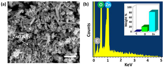Morphology analysis of ZnO. (a) SEM image of ZnO confirming the growth of NRs. (b) EDAX plot of ZnO. The inset in the figure shows the weight percentages of the elements in the ZnO.
