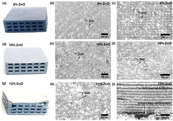 The structure analysis of the 3D-printed lattice block. (a) A picture of the sample printed with 8 wt% ZnO loading in resin. (b) A surface SEM image of the lattice block, 3D-printed with 8 wt% of ZnO. (c) A cross-sectional SEM image of the 8 wt% ZnO sample. (d) A photograph of the sample printed with 10 wt% ZnO loading in resin. (e) A surface SEM image of the lattice block, 3D-printed with 10 wt% of ZnO. (f) A cross-sectional SEM image of the 10 wt% ZnO sample. (g) A picture of the lattice block, 3D-printed with 12 wt% of ZnO. (h) A surface SEM image of the lattice block, 3D-printed with 12 wt% of ZnO. (i) A cross-sectional SEM image of the 12 wt% ZnO sample.