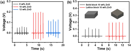 The piezoelectric response of the 3D-printed blocks with an effective area of 4 cm2. (a) The open circuit output voltage of the lattice-structured 3D-printed blocks with different weight percentages of ZnO loading under a 3 N force and a 1 Hz frequency. (b) The open circuit output voltage of the lattice-structured and solid 3D-printed blocks with 10 wt% of ZnO under a 3 N force and a 1 Hz frequency.