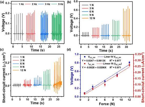 The piezoelectric response of the 3D-printed 10 wt% ZnO-loaded lattice-structured block with an effective area of 4 cm2. (a) The open circuit output voltage under different frequencies and 3 N of force. (b) The output voltage under varying forces at 1 Hz. (c) The short circuit current density under varying force at 1 Hz. (d) Linear relationships of peak-to-peak piezoelectric voltage and short circuit current density with varying loads under 1 Hz.
