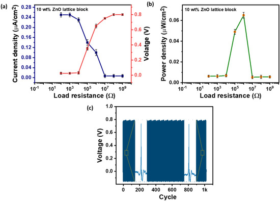 (a) Voltage and current density versus load resistance for the 10 wt% ZnO-loaded lattice block under 6 N and 1 Hz. (b) Power density versus load resistance. (c) Output voltage for 1000 cycles of loading and unloading of 6 N force at 1 Hz. The yellow-outlined square represents the zoomed-in image of the generated piezoelectric voltage signal during the initial of final force cycles.