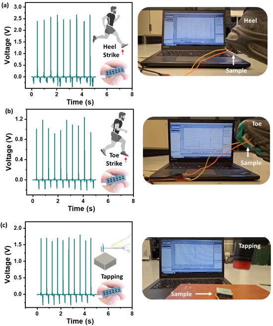 The following supporting information can be downloaded at: https://www.mdpi.com/article/10.3390/polym16212967/s1; Video S1: Energy harvesting with heel strike; Video S2: Energy harvesting with toe strike; Video S3: Energy harvesting with tapping.