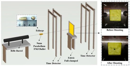 The samples were ballistically tested at the impact velocity ranging from 230 m/s to 330 m/s in the ballistic laboratory. The ballistic apparatus consisted of a firing device with a 7.62 mm rifle barrel, the target holder and time detectors in an enclosed environment, as shown in Figure 3. Propelled by gunpowder, the rifle barrel fired the projectile, which penetrated the full-clamped fabric fixed on the target holder. The projectile was a 9 mm Parabellum FMJ bullet with a weight of 8 g. The time detectors picked up the travelling time of the projectile before and after it penetrated the fabric to calculate the impact velocity and the exit velocity. The loss in kinetic energy carried by the projectile after penetrating the fabric was calculated using the following equation: ΔE = 1/2 (mV02) − 1/2 (mV12), where ΔE is the loss of kinetic energy, m is the projectile mass, V0 is the impact velocity, and V1 is the exit velocity.