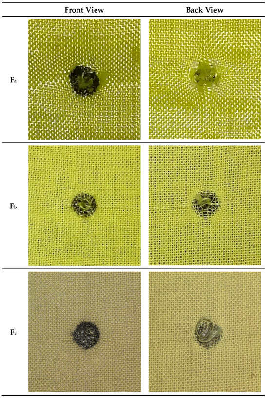 The energy absorption of the fabric can be calculated according to the following equation: ΔE = 1/2 (mV02) − 1/2 (mV12) and is mainly reflected in the energy absorbed by the warp and weft yarns. The samples of Fa with impact velocity 290.8 m/s, Fb with impact velocity 300.6 m/s, and Fc with impact velocity 297.8 m/s were chosen for comparison as they have similar impact velocities, but Fc and Fb have larger energy absorption than Fa, and Fb shows the highest, which demonstrates the overall trend, as shown in Figure 9. The comparisons among them may be more convincing. The main discoveries are found as follows: