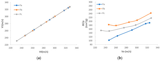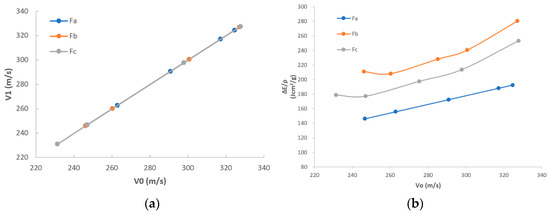 In Figure 5a, it can be seen that the overall trend of impact velocity (marked as ) vs. exit velocity (marked as ) is similar among Fa, Fb, and Fc. This may indicate that with the increase in , Fa, Fb, and Fc show similar variations of . Additionally, increases following the tendency of , as the similar stable trend with no fluctuation is discovered for Fa, Fb, and Fc. It could be concluded that there is no certain special value that could apparently influence the results, as the difference in velocity before and after the fabric is shot is inclined to be unchanged.