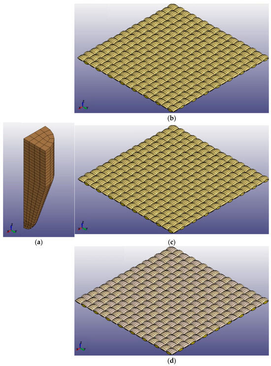 The geometrical models were further meshed using Hypermesh software 2020. Hypermesh is one of the most popular softwares dealing with finite elements codes, because of its computational efficiency and strong robustness. There were 30,720 elements for the Fa model, 61,440 elements for the Fb model, and the same for the Fc model, as Fb and Fc are only different in the composition of staple fiber spun on the CSC yarn. The geometrical model of projectile was established based on the parameters of a 9 mm Parabellum FMJ bullet, which was then meshed with 435 hexahedron elements on the body and 199 tetrahedron elements at the bottom.
