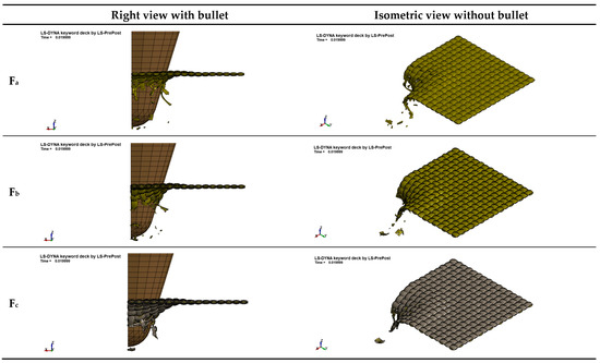 The meshed geometrical model was further processed to complete the establishment of the FEA model by setting definition of material properties, definition of section properties, and application of boundary conditions and velocity to the bullet. All the information was saved as K files in LS-DYNA software. The 1/4 FEA models for Fa, Fb, and Fc with a bullet are individually shown in Figure 7.