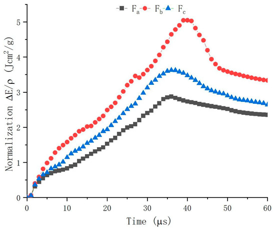 Apart from that, for Fa, Fb, and Fc, the peak values of energy absorption in total are different, as shown in Figure 10. For Fa, the trend increases steeply, arrives at the peak value around 35 µs, and then decreases gradually. However, the whole procedure of Fa is still comparatively smoother, compared to Fb and Fc. The peak value of Fa is apparently lower than that of Fb and Fc. This may indicate that during the whole procedure against the projectile penetration, the capability of energy absorption of Fa is always weaker than Fb and Fc and cannot surpass them at any moment. For Fb and Fc, both increase steeply in the first period of 30 µs, then Fc stays at its peak value around 3.5 Jcm2/g around 35 µs and decreases gradually, while Fb fluctuates apparently and achieves its peak value around 5 Jcm2/g at 40 µs. The difference in the composition of staple fiber to form CSC yarns may be the reason for the difference between Fb and Fc.