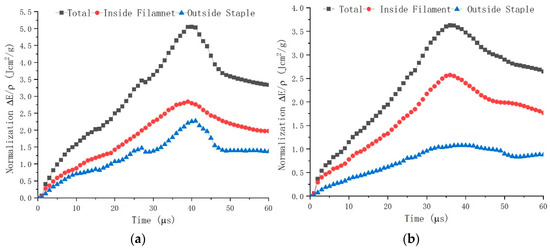 As a matter of fact, the ballistic performance of the fabric is, indeed, influenced by the different outside staple fibers used in the CSC yarns though the same Kevlar® 29 filament yarn used inside. The composition of the outside staple fiber is aramid and polyester for Fb and Fc, respectively, and the corresponding energy absorption capability is varied differently. As can be seen in Figure 11a, the value of aramid staple fiber increases smoothly until 25 µs, then increases steeply at 40 µs and finally decreases, which demonstrates a similar trend as the total trend. In Figure 11b, the value of polyester staple fiber increases very stably until 35 µs and then decreases slowly, which is totally different from the trend of the value of aramid staple fiber shown in Figure 11a. In addition, it can be noticed that regardless of the staple fiber used, either aramid or polyester, the value of filament shows a similar trend in both Figure 11a,b; it increases slowly until at the top value around 2.5 Jcm2/g, and then decreases slowly. This may indicate that the difference in outside staple fiber may have little influence on the energy absorption capability of the inside filament.