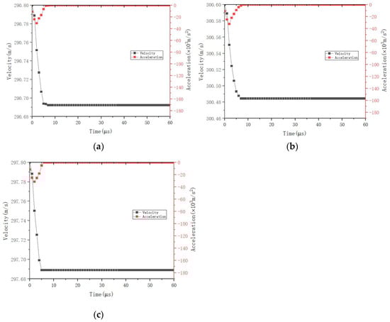 The characteristic of acceleration is an important index to reflect the details of ballistic performance. As shown in Figure 12, it can be noticed that the largest increasement of acceleration appears for all fabrics (including Fa, Fb, and Fc) during the first stage, namely, from the start point to around 3 μs. This is because in the beginning, the projectile has the largest energy to hit the fabric, and the yarn in the fabric receives the stress from the projectile and is inclined to offer penetration resistance.