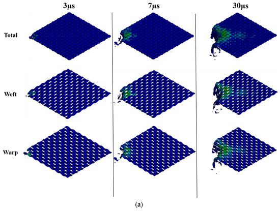 Figure 8 shows that fabrics under ballistic test were successfully illustrated by the FEA model. It could be discovered that yarn failure, yarn fracture, and yarn pull-out, which are major characteristics found in experimental testing, could also be clearly shown by the FEA model. This is because of the activities of two typical waves. According to the energy absorption mechanism, when the projectile hits the fabric, two types of waves (longitudinal wave and transverse wave) come out and propagate through primary yarns and secondary yarns. The longitudinal wave travels through primary yarns, which are directly hit by the projectile, and secondary yarns, which are not directly hit by the projectile but interact with primary yarns in the plane of the target plate. The transverse wave propagates outwards from the impact zone to make deformation in the perpendicular direction to the fabric plane, leading to the phenomena including yarn failure, yarn fracture, and yarn pull-out that could be observed at the location hit by the projectile.