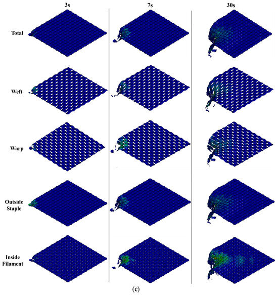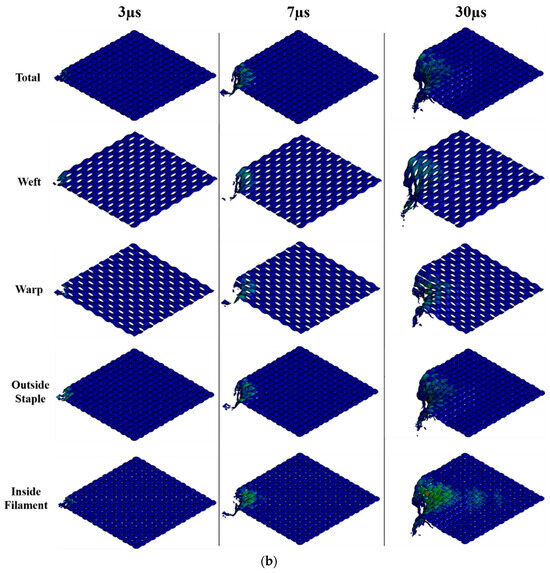 In the first stage from the start point to 3 μs, the projectile hits the largest penetration resistance and is going to penetrate the whole structure. It can be noticed that stretching is the major formation in the structure to withstand the largest initial penetration in the beginning. All the related yarns are resisting this penetration in the formation of stretching, and some locations (especially the hit area) are further breaking. Though Fb and Fc are composed of CSC yarns with more complicated yarn structure, they demonstrate similar characteristics, as the outside staple and inside filament show similar responses to ballistic penetration.