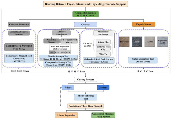 The overall research approach is illustrated in Figure 1, which outlines both the experimental design and the predictive modeling process. The experimental design isolates the impact of each variable—composite specimen configuration, anchoring methods, façade stone type, and curing duration—on bond strength. Following the experimental phase, predictive models are employed to estimate shear bond strength using linear regression and a Generalized Mamdani Fuzzy System based solely on data from the 7-day curing process.