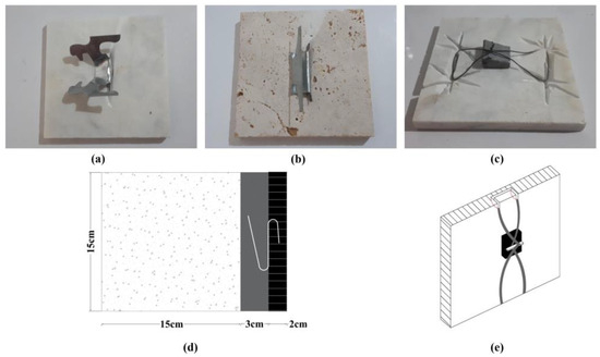 In wall cladding systems, particularly for façade installations, back anchoring methods are commonly used to secure façade stones to the concrete substrate. In this study, butterfly-type clips, Z-type clips, and wire ties were selected for their ability to provide mechanical interlock. The anchorage system was first attached to the façade stones, with one part of the anchor embedded in the stone and the other part positioned within the adhesive mortar. This configuration connected the façade stone to the unyielding concrete support, ensuring stability and load transfer. The full installation process, including the bonding of the anchorages to the façade stones, is illustrated in Figure 5.