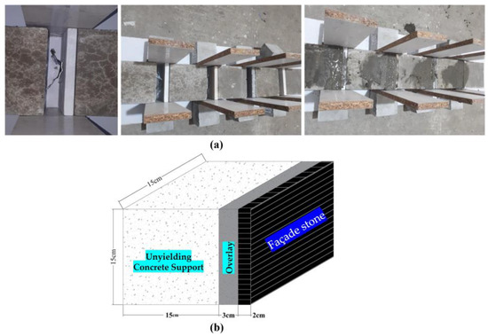 The composite specimens in this study consist of three primary components: unyielding concrete supports, an overlay, and façade stones.