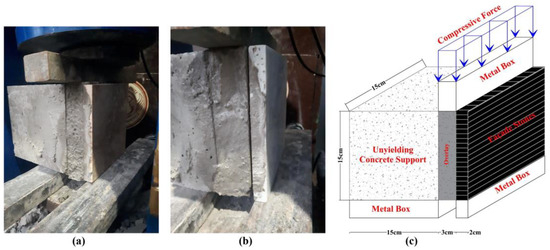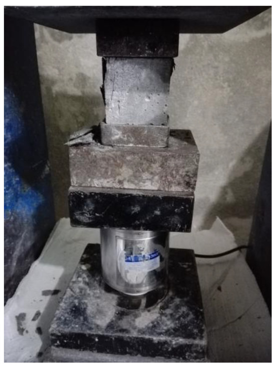 In this test, a vertical compressive force was applied to the composite specimen, which consisted of a 15 × 15 × 15 (cm) unyielding concrete support, a 3 cm-thick adhesive mortar layer, and a 2 cm-thick façade stone. The load was transmitted through a metal box to ensure uniform pressure distribution across the adhesive interface (Figure 8). The test aimed to simulate the mechanical stresses encountered by façade cladding systems in practical applications.
