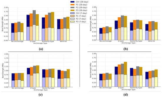 The shear bond strength between the façade stones and the concrete substrate was evaluated using a shear splitting test. The specimens were tested under four anchorage configurations: Z-type clips, butterfly-type clips, wire ties, and no anchorage. The cement–sand adhesive mortar was reinforced with varying dosages of polypropylene fibers: 0%, 0.1%, 0.2%, and 0.3% by volume. The façade stones tested included travertine, granite, marble, and crystalline marble. Bond strength measurements were taken after 7 and 28 days of curing, and the results are presented in Figure 9a–d.