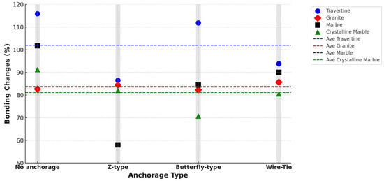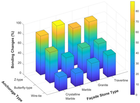 It is evident from the figure that the Z-type clip provides the highest bond strength increase across all stone types, with improvements ranging from 75% to 89%. This significant enhancement can be attributed to the uniform distribution of shear stresses across the adhesive interface, particularly benefiting stones like marble, which exhibited a peak improvement of 89.18%. The effectiveness of the Z-type clip can be linked to its design, which facilitates greater mechanical interlocking and adhesion between the stone and the substrate. With the installation of the Z-type clip anchorage on the specimens, the denser texture of the marble allowed for a stronger connection between the anchorage and the stone. The Z-type clip provides a more effective mechanical interlocking with the façade stone compared to other anchorage types, such as the butterfly-type clip and wire tie. This enhanced interlocking is particularly beneficial for denser stones such as marble, as it allows the anchorage to better engage with the stone’s surface, resulting in a significant improvement in bond strength. In contrast, the Butterfly-type clip and Wire tie did not achieve the same level of interlocking, leading to less pronounced improvements in bond strength for marble.