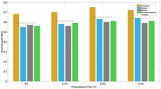 Even a modest addition of 0.1% polypropylene fibers showed a clear improvement over the non-fibered mortar (P0.0), increasing the bond strength from 0.59 MPa to 0.61 MPa. This underscores the beneficial role of fiber reinforcement in adhesive performance. Notably, travertine consistently exhibited the highest bond strength across all polypropylene fiber dosages, outperforming the other stones in both non-fibered and fiber-reinforced mortars. This may be attributed to its higher porosity and the resultant increased mechanical interlock between the stone and the adhesive mortar. These findings underscore the importance of fiber dosage optimization, with 0.2% offering the best balance between enhanced bond strength and material efficiency.