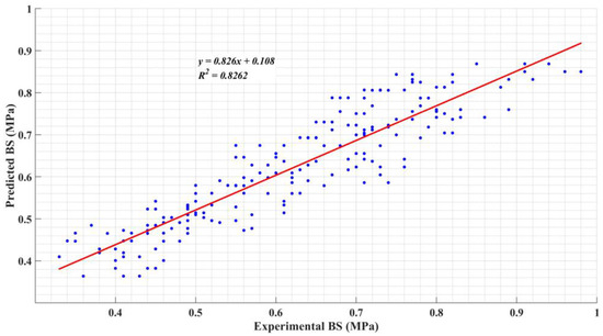 The model’s accuracy was evaluated by comparing predicted values to experimental results, as shown in Figure 13. The R2 value, a key indicator of the model’s fit, was found to be 0.8262, suggesting a reasonably strong correlation between the predicted and actual bond strength values.