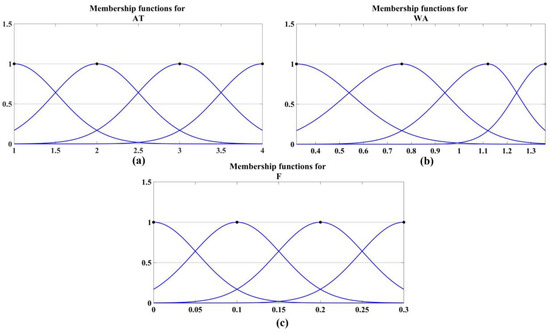 The fuzzy logic system, with its generalized Mamdani inference engine and Dombi t-norms, was applied to predict the bond strength between façade stones and their concrete substrates. Three input variables were considered: anchorage type, water absorption of the façade stone, and the volume percentage of polypropylene fibers in the adhesive mortar. Gaussian membership functions were defined for these inputs, as shown in Figure 14.