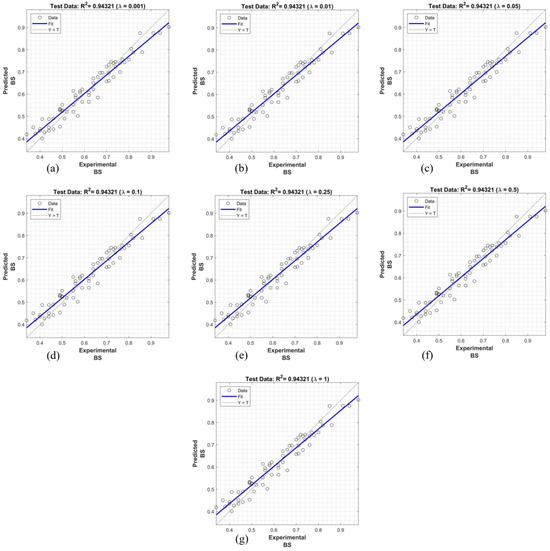 Prediction of bond strength with proposed fuzzy logic inference system using Dombi family of t-norms: (a) λ = 0.001, (b) λ = 0.01, (c) λ = 0.05, (d) λ = 0.1, (e) λ = 0.25, (f) λ = 0.5, and (g) λ = 1.