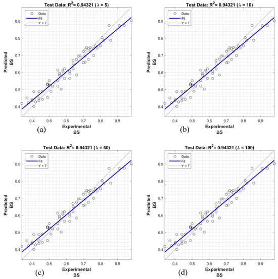 Prediction of bond strength with proposed fuzzy logic inference system using Dombi family of t-norms: (a) λ = 5, (b) λ = 10, (c) λ = 50, and (d) λ = 100.
