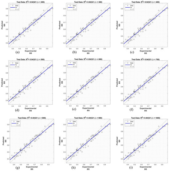 Prediction of bond strength with proposed fuzzy logic inference system using Dombi family of t-norms: (a) λ = 200, (b) λ = 300, (c) λ = 400, (d) λ = 500, (e) λ = 600, (f) λ = 700, (g) λ = 800, (h) λ = 900, and (i) λ = 1000.