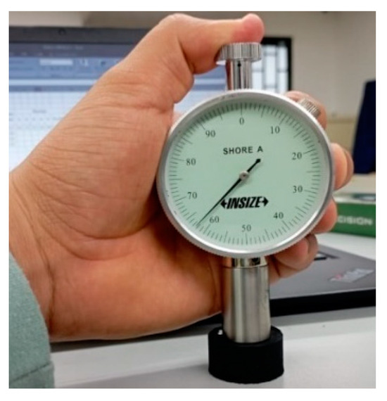 The hardness of the matrix was determined in accordance with ASTM D2240 [26] using the Shore A durometer at the Materials and Processes Laboratory of PUJ Cali (Figure 4). This test measures the penetration resistance on the Shore A scale, which is suitable for softer materials. For each matrix, three specimens were fabricated, and five measurements were taken for each specimen. The specimens had a cylindrical geometry with a diameter of 28.6 mm and a height of 12.5 mm. A minimum of five readings were taken per specimen, with each reading separated by at least 6.00 mm (0.24 in).
