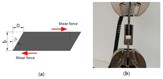 The cyclic shear test was conducted in accordance with Method B of ASTM D4014 [27], using the setup illustrated in Figure 5b. The test specimens consisted of rectangular rubber sheets measuring 40 mm in length, 30 mm in width, and 7.5 mm in thickness, which were manufactured separately and bonded using epoxy. Three specimens from each matrix were tested. The test involved applying 10 loading and unloading cycles at varying deformations (γs) of 10%, 20%, 30%, 50%, 75%, and 100%, period of 9s (maximum of machine), by adjusting the maximum displacement D (Figure 5a). The tests were carried out using an INSTRON 3366 universal testing machine with capacity of 10 kN, located in Laboratorio Materiales y Procesos at PUJ Cali (Figure 5b). These deformation percentages correspond to the maximum strains that an isolator might experience during operation. The chosen deformation values align with FEMA guidelines, which recommend that isolators be tested prior to installation under bidirectional loads, with deformations exceeding (a) 25%, (b) 50%, (c) 67%, and (d) 100% of design deformation [23,28].