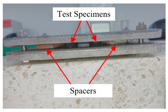 The residual compression test was performed in accordance with Method B of ASTM D395 [30]. This test measures the deformation of a specimen after exposure to a constant compressive load under elevated temperature conditions. Cylindrical specimens were placed between steel plates with a spacer, allowing for a 25% deformation when secured with bolts, as illustrated in Figure 7. The assembly was then placed in an oven at 70 °C for 22 h. After this period, the specimens were removed from the assembly and left to rest at room temperature on a low thermal conductivity surface, such as wood, for 30 min. The final specimen height was subsequently measured to determine the residual compression, using the formula CB = [(t0 – ti)/(t0 – tn)] × 100, where t0 is the original specimen thickness, ti is the final specimen thickness, and tn is the thickness of the spacer.