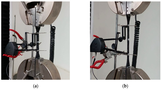 The tensile strength of the recycled rubber was evaluated according to the procedure outlined in ASTM D412 [31]. As depicted in Figure 8, dumbbell-shaped specimens were clamped at both ends using grips and elongated until rupture. The test measured tensile stress, tensile strength, and the maximum yield point, with the elongation rate set at 50 ± 5 mm/min. Strain measurements were obtained using an extensometer.