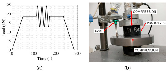 A cyclic compression test was conducted at the Mixing Laboratory of Pontificia Universidad Javeriana Cali to evaluate the mechanical response of the prototypes to compression loads and to determine their experimental vertical stiffness (Kvdex). The test utilized a Geotest Instrument Corp machine with a compression capacity of 5 tons. Displacements during the test were accurately measured using a linear variable differential transformer (LVDT), as shown in Figure 11b.