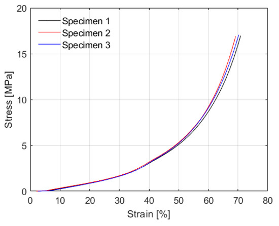 The matrix evaluated, M4, is an agglomerate of rubber particles. Initially, there is an accommodation of these particles when compressive stresses are applied, allowing deformations with relatively low stresses. This phenomenon contrasts with the behavior of natural rubber, which has a more compact structure due to vulcanization, and therefore does not exhibit this initial accommodation to such an extent. Figure 16 shows the results obtained for 3 specimens tested. At 65% strain, the specimens reached an average compressive stress of 12.16 MPa and once the specimens were unloaded, the majority of the deformation (97%) was recovered. However, there is a notable difference compared to the values reported by Madera et al., who obtained 25 MPa using natural rubber [6], but with better performance than that obtained by Madera et al. with recycled rubber [21], registering a value of 6 MPa. The effects of high deformations, as well as lateral expansion due to vertical forces, can be counteracted with additional reinforcement in the design of the isolator. Such reinforcement will adequately resist the stresses transmitted by the supported structure [28,34].