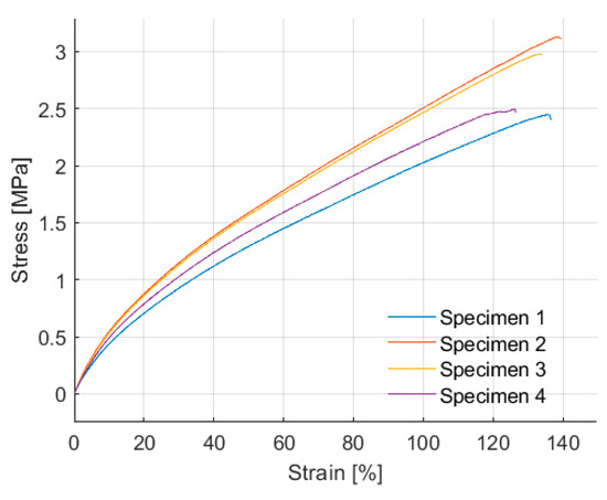 Four specimens were tested under tensile stresses according to ASTM D412. As shown in Figure 17, the recycled rubber specimens reached maximum strains between 126% and 138% before failure, with tensile stresses ranging from 2.45 MPa to 3.13 MPa. These values differ significantly from the typical behavior reported for natural rubber [6], which can achieve elongations of over 500% or even 630% under tension, as summarized in Table 10. However, compared to the recycled rubber studied by Madera et al. [21], there was a 46% improvement in maximum elongation. The tension test results show moderate variability in the maximum deformation, with a standard deviation of 4.5, indicating relatively uniform behavior. Regarding the maximum tensile stress, the standard deviation of 0.3 reflects a high level of consistency in the tests. The limited extensibility of recycled rubber is attributed to its composite material nature, where the agglomerated particle matrix restricts stretching capacity. Although the recycled rubber matrix exhibits some ductility, it shows a reduced ability to withstand large elastic deformations without rupture compared to monolithic natural rubber. These mechanical properties could present a challenge in the design of seismic isolators, where high elongations are typically required [17].