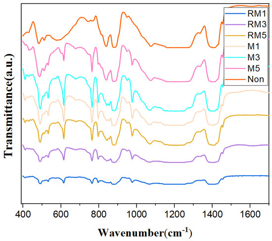 Xα and Xγ in Equation (4) denote the mass fractions of the α and γ phases, respectively, Aα and Aγ denote the absorbance of the material at 764 cm−1 and 840 cm−1, respectively, and Kα (6.1 × 104 cm2 mol−1) and Kγ (7.7 × 104 cm2 mol−1) represent the absorption coefficients of the α and γ phases, respectively. By calculating the order from the smallest to the largest modulation time for the non-magnetic field, horizontal static magnetic field and horizontal rotating magnetic field, the γ-phase contents of the seven samples were 3.97%, 47.7%, 54.8%, 12.6%, 44.8%, 42.9%, 44.2%, respectively. Among them, the γ-phase content of M3 was as high as 54.8%.