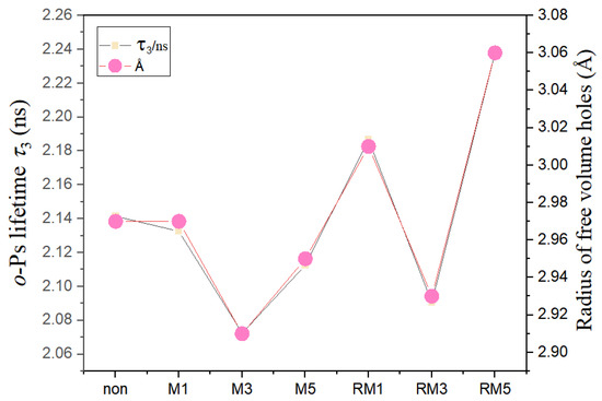 The effect of magnetic field modulation on the microstructure of polymers, such as free-volume pore size, indirectly changes the electrical properties of polymers. Measuring the free-volume pore size of polymers using positron annihilation lifetime spectroscopy has the advantages of high accuracy and no damage to the original structure. The positron annihilation lifetime spectrum is measured using a conventional fast-fast conformal lifetime spectrometer. A 22Na source (with an activity of about 12μCi) was sandwiched between two sheet samples of the same size and thickness (the thickness of the samples was about 1–2 mm), wrapped in tin foil and placed between the two detectors for the measurements, and each spectrum contained 106 counts, which were solved using PATFIT software to obtain the positron lifetime value parameter. All measured spectra were decomposed into three components (τ1, τ2, and τ3) and discretised using PATFIT. The long lifetime component τ3 is attributed to the segregated annihilation of o-Ps in the free-volume holes in the amorphous region, as shown in Figure 4. It can be observed that the o-Ps lifetime τ3 and the free-volume hole size of the field-free modulated films are 2.14 and 2.7 Å, respectively, and the free-volume hole size is almost unchanged after the directionally static magnetic field treatment for 1 min, and the free-volume hole size exhibits an initial decrease. Then, the free-volume pore size shows a tendency to decrease and then increase with the increase in time. Overall, the free-volume pore size was reduced by the static magnetic field. Similarly, the free-volume pore size decreased and then increased with time for films treated with uniformly varying magnetic fields. However, a rotating magnetic field can increase the free-volume pore size.