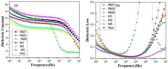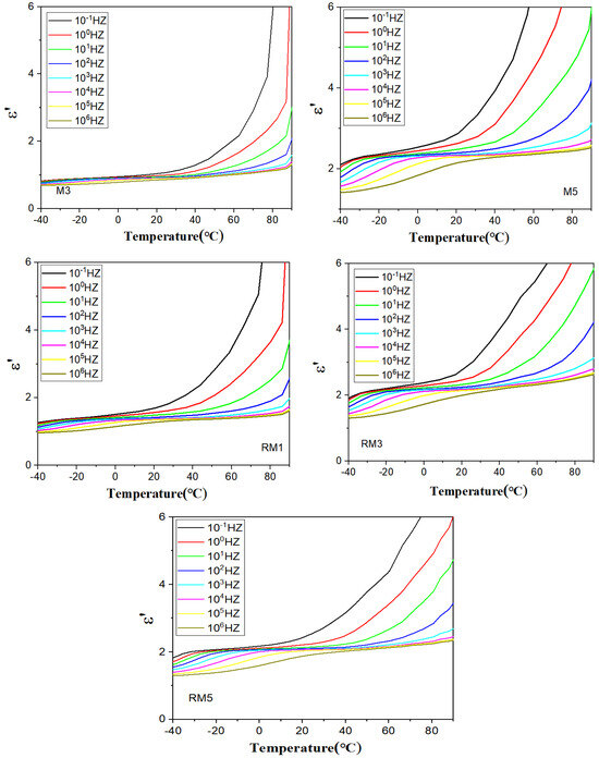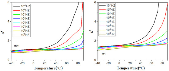 Figure 6 shows the dependence of the real part of the dielectric constant on the temperature, with a wave peak in the low-temperature region, which represents the glass transition temperature of PVDF, Tg [29,30,31]. As the frequency increases, the wave peaks move significantly towards the high-temperature region, which typically involves thermally activated relaxation, suggesting that more energy is required to complete the movement of the chain segments at high frequencies.