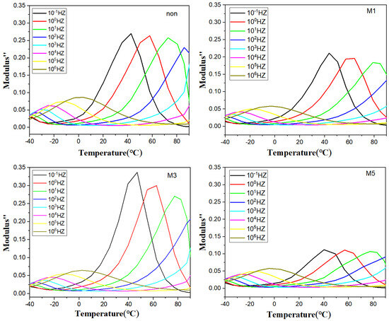 Figure 7 shows a plot of the imaginary part of the dielectric modulus of the polymer film versus temperature. As shown in the figure, it is clear that there are two characteristic peaks in the lower and higher temperature regions: the α-relaxation peak in the lower temperature region originates from the relaxation of molecular chains in the amorphous area of the PVDF inside the polymer, and its thermally activated chain movement with increasing temperature leads to a shift in the α-relaxation peak to the higher frequency region. The peaks in the samples gradually move to higher frequencies with increasing temperature, which is due to ionic leaps. M3 has the highest interfacial polarisation peak and may have better energy storage properties.