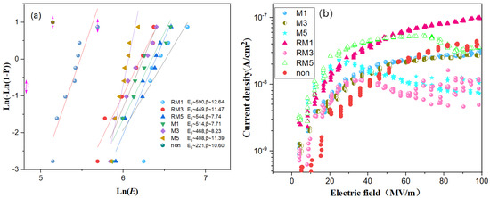 (a,b) The two-parameter Weibull distribution of breakdown strength and leakage current, respectively.
